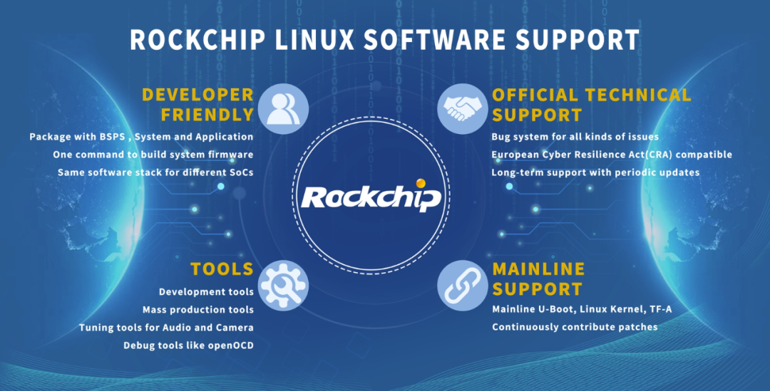Το RockChip παρέχει ολοκληρωμένη υποστήριξη διασφάλισης λογισμικού και η πλατφόρμα chip mainstream συνεχίζει να ενημερώνει και να προσαρμόζεται στις τελευταίες εκδόσεις Linux και Android System, παρέχοντας πακέτα λογισμικού συστήματος και εφαρμογών για παγκόσμιους προγραμματιστές. Οι συνεργάτες και οι προγραμματιστές σε διάφορους τομείς μπορούν να αποκτήσουν τεχνική υποστήριξη για όλους τους τύπους προβλημάτων και διάφορα εργαλεία ανάπτυξης και εντοπισμού σφαλμάτων στην επίσημη πλατφόρμα RockChip. Από την άποψη της υποστήριξης ασφαλείας, το RockChip παρέχει ολοκληρωμένους μηχανισμούς ασφαλείας, όπως ασφαλές secureboot, TrustZone, κρυπτογράφηση και μηχανή αποκρυπτογράφησης, για να αποτρέψει την παραβίαση της ακεραιότητας του υλικολογισμικού.